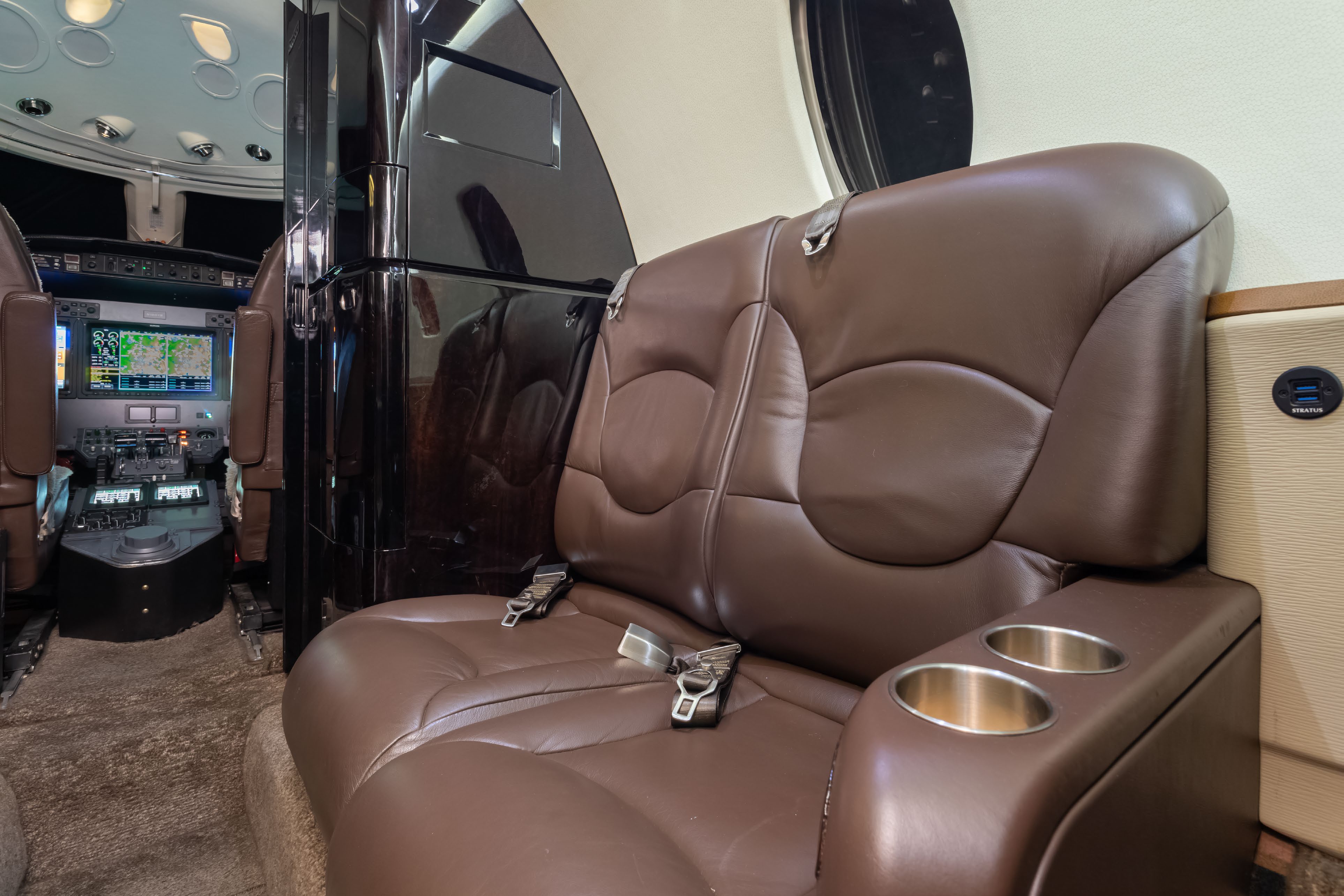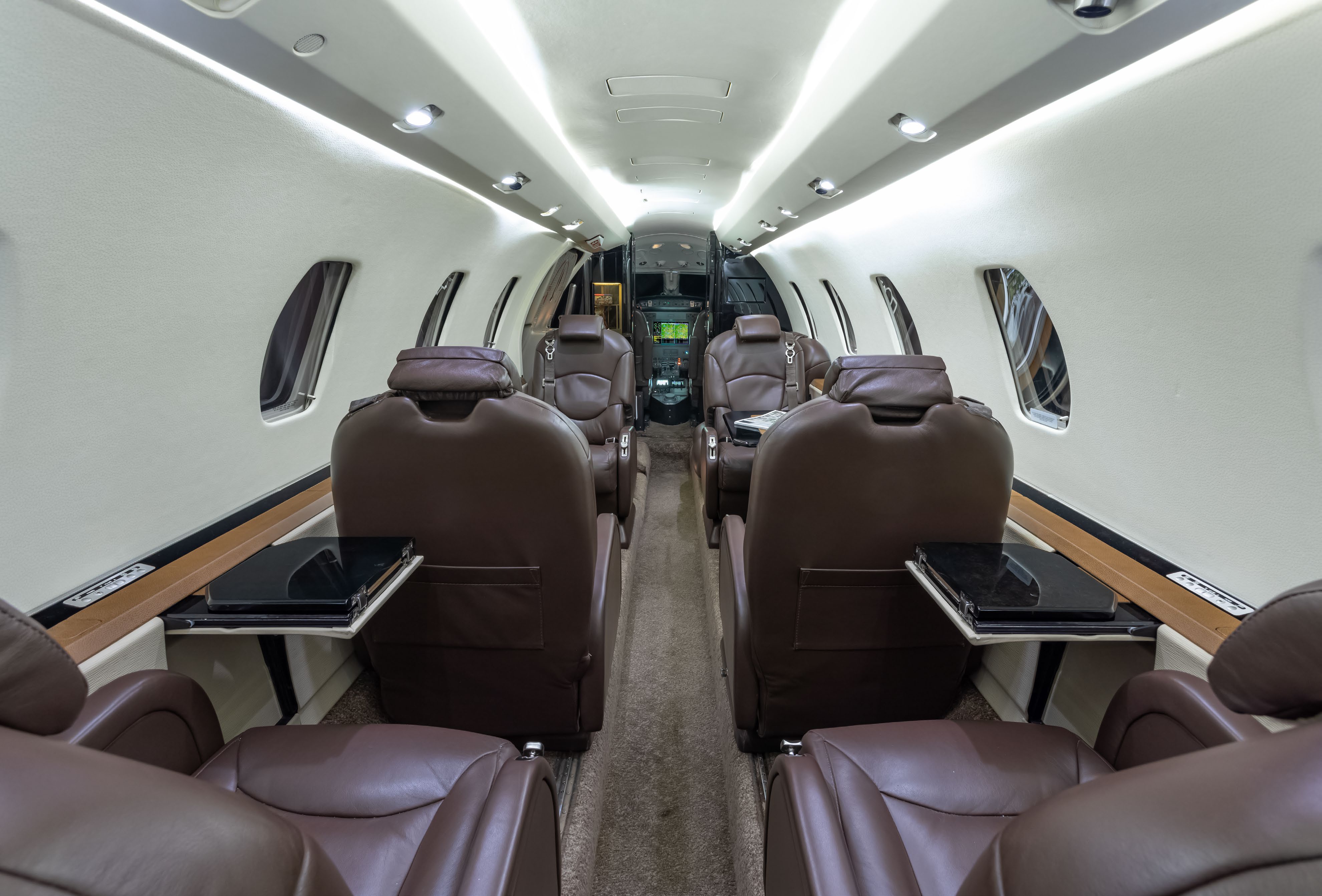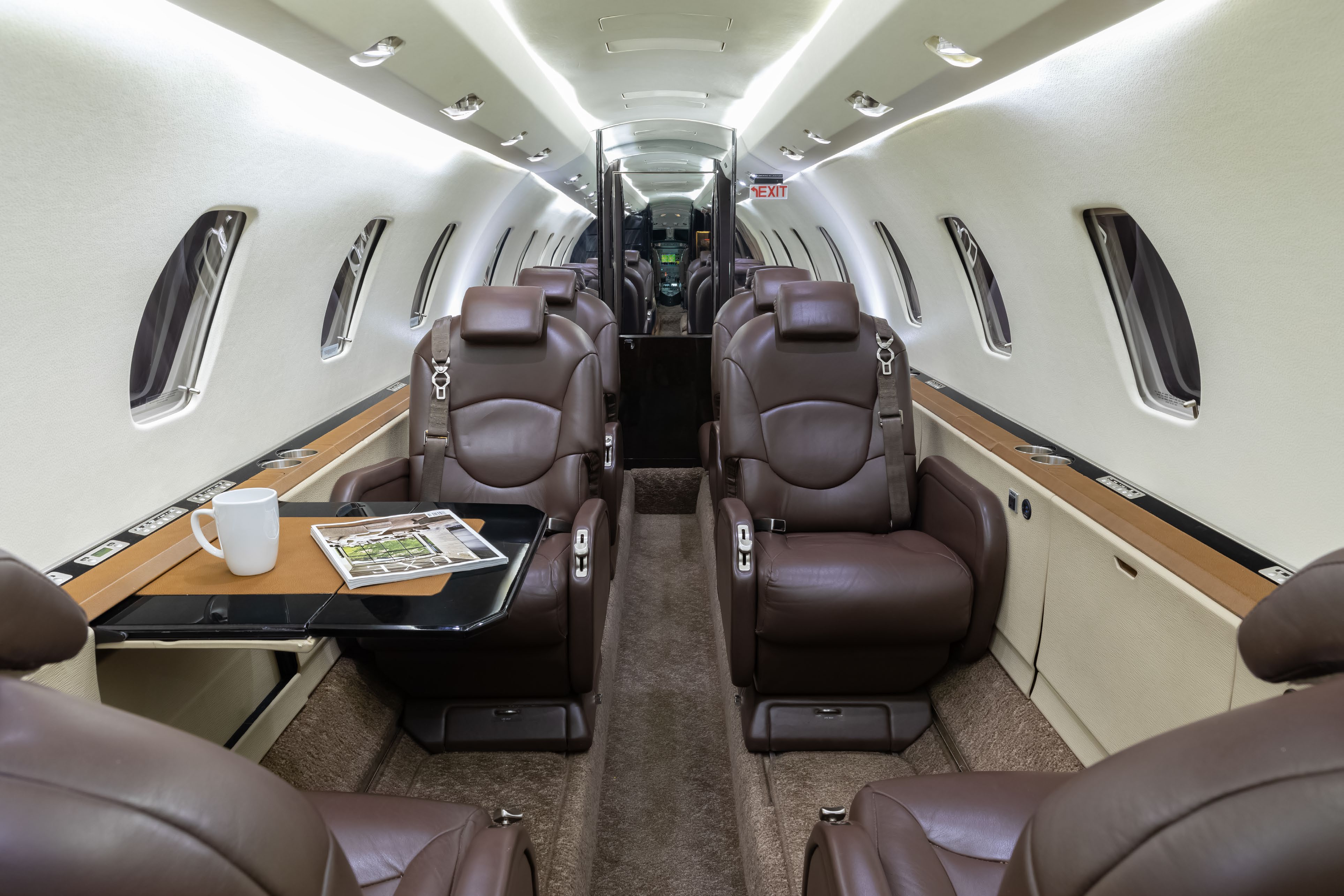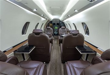 (2019 by Stevens Aviation, Greensboro) This aircraft features an executive 9-passenger interior configuration consisting of a forward 2-place divan, a midcabin center club layout, and dual aft forward-facing chairs, along with a belted lavatory seat. The cabin is appointed with rich brown leather seating, complemented by beige sidewalls and wood trim accents. Forward Cabin: Forward two (2) place divan Mid Cabin: Four (4) Place Club Aft Cabin: Two (2) Forward Facing Club Seats Forward and Aft Lavatories: Aft belted lavatory |