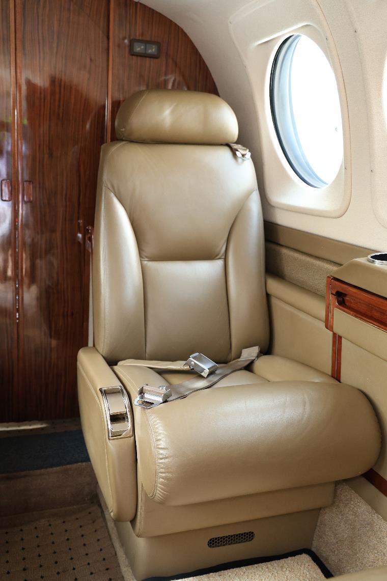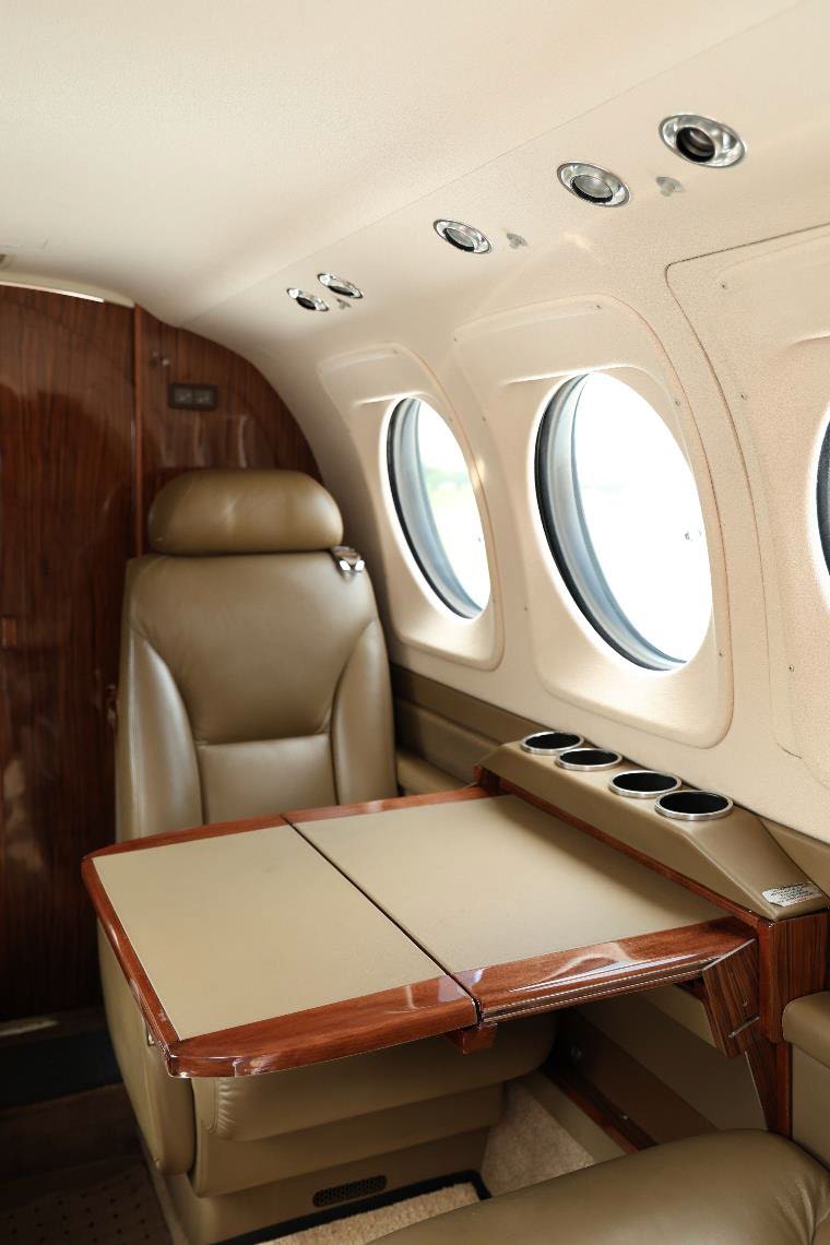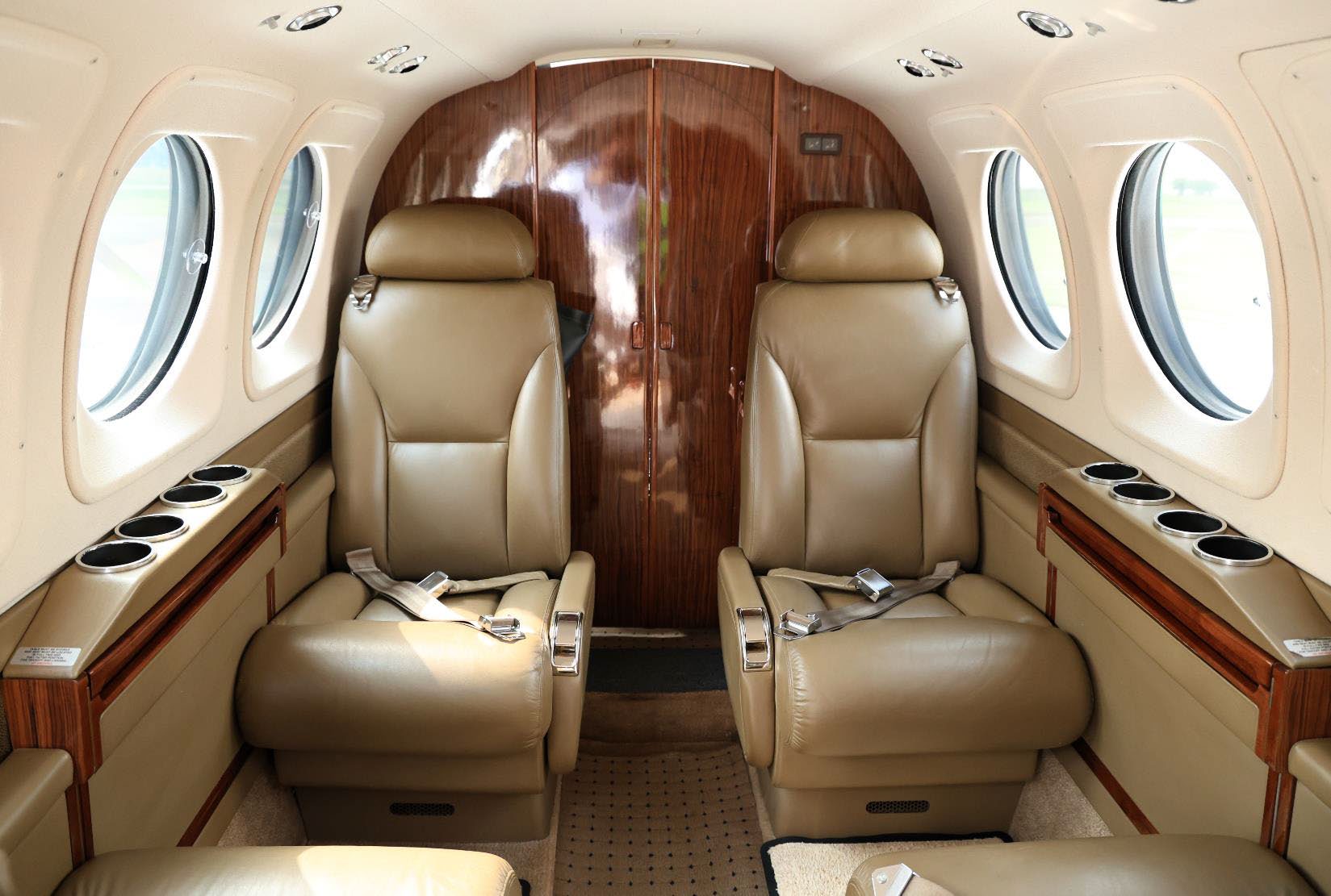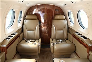 (Original) The King Air C90GTx offers a spacious cabin configured for up to Six (6) passengers. The interior features a four-place club arrangement, followed by a belted, side-facing Lavatory and a single seat in the baggage area. |