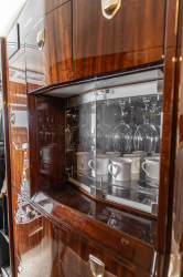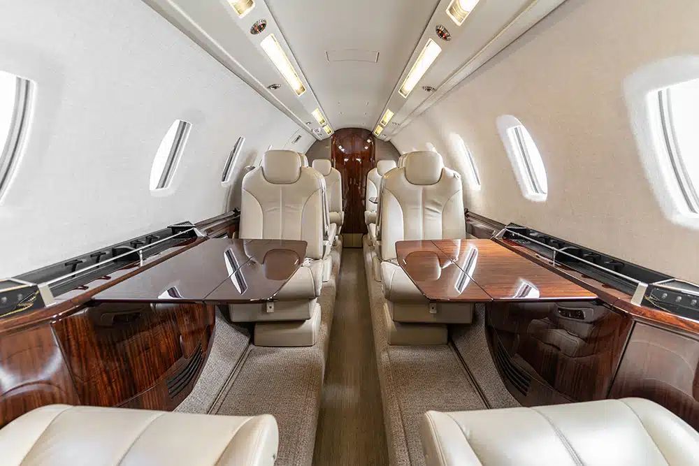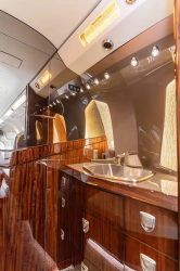 Double club seating with a belted lavatory seat. Left hand forward closet, right-hand galley, with interchangeable side facing seat, and four executive tables. The aft lavatory has a vanity cabinet with sink, externally serviceable flushing toilet. Galley includes microwave oven. Extremely well maintained. Color: Bisque |