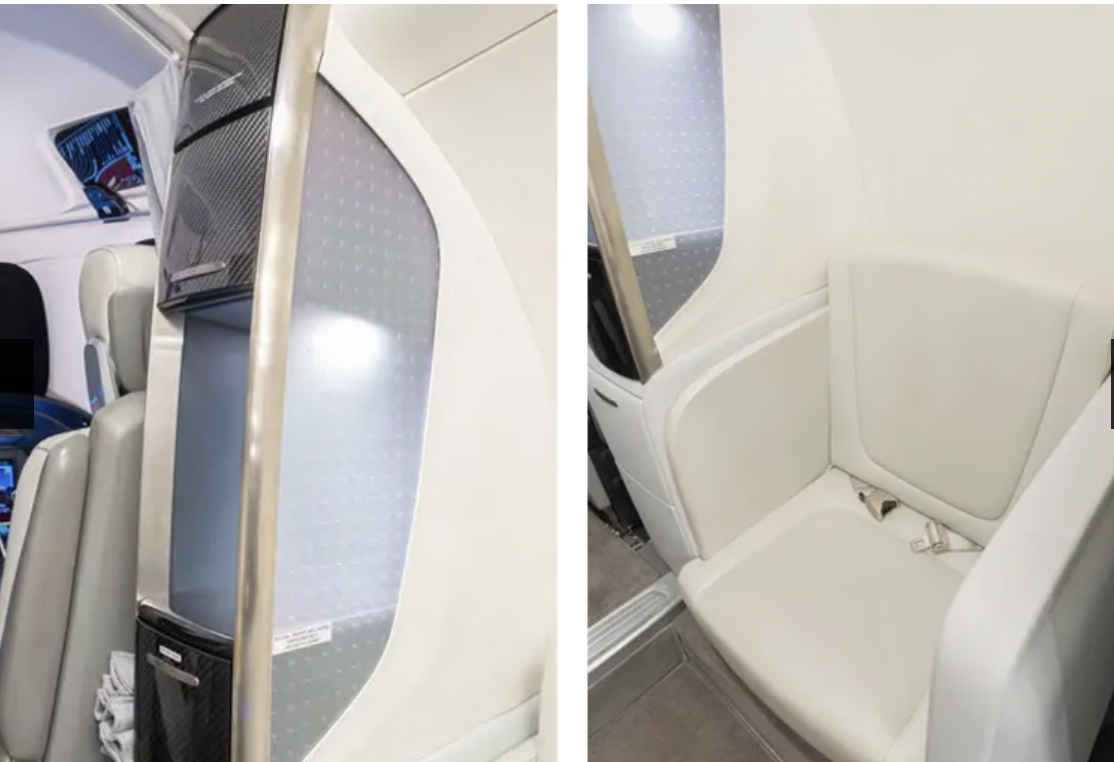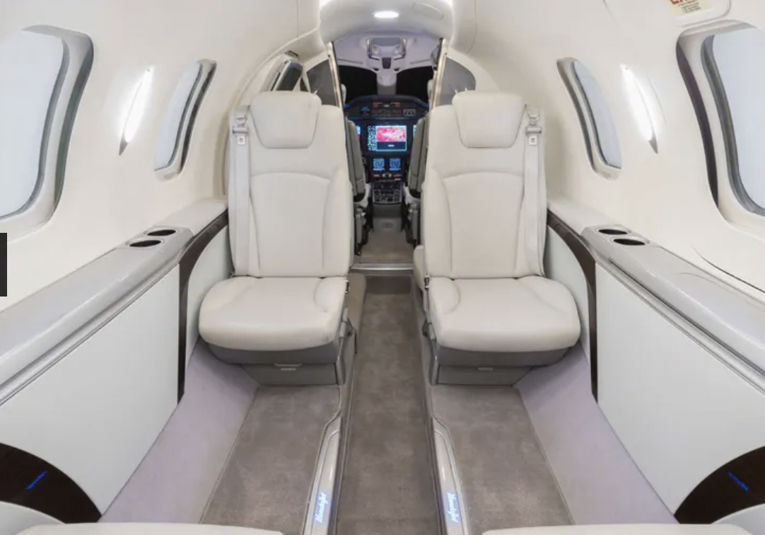 | Five (6) Passenger Interior featuring a Forward Side Facing Seat Followed by Four (4) Executive Chairs All Completed in Cool Grey Leather. The Interior is Accented with Dark Grey Accent Colors, Brushed Ice Silver, and Eucalyptus Trim | |