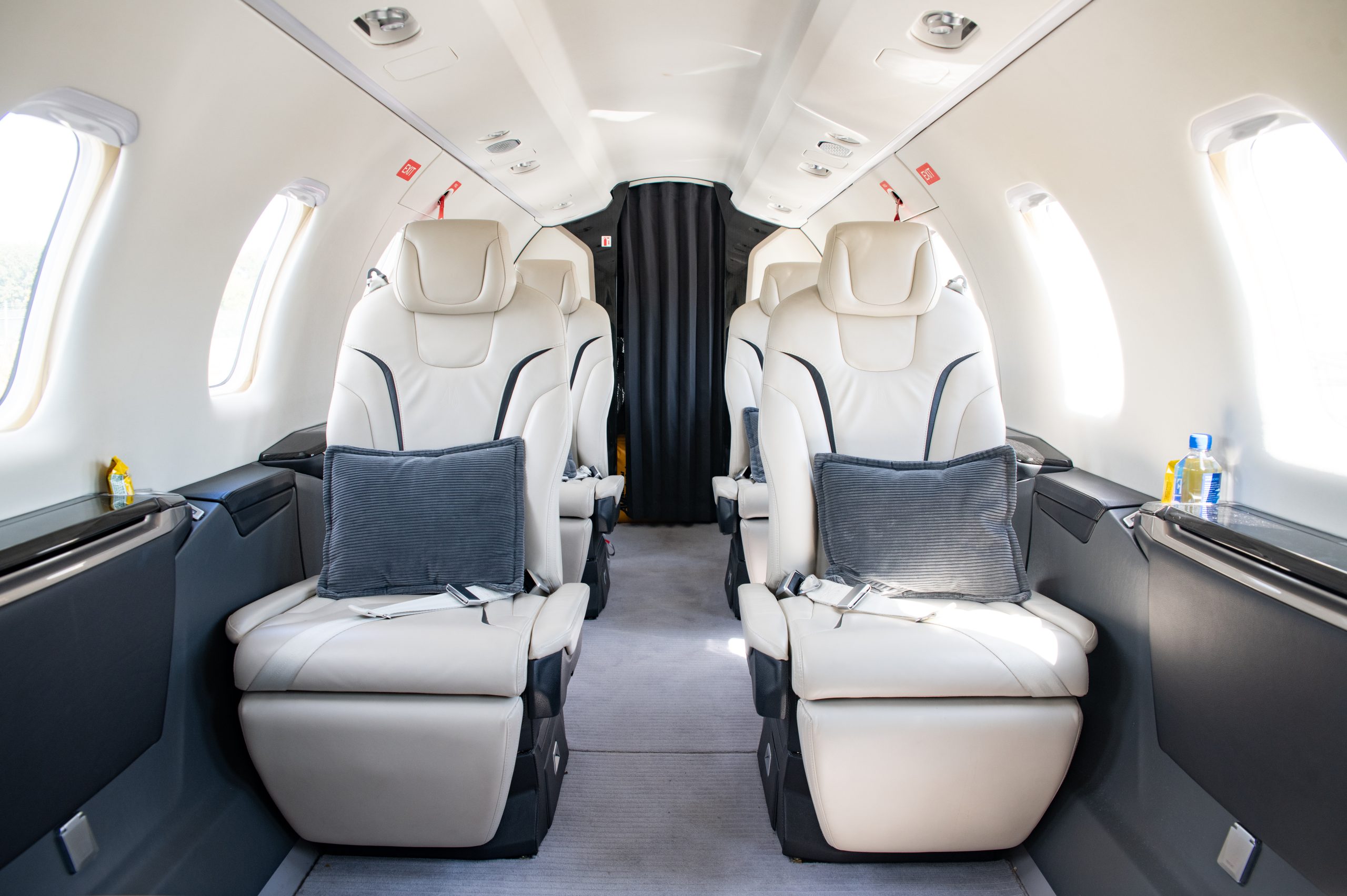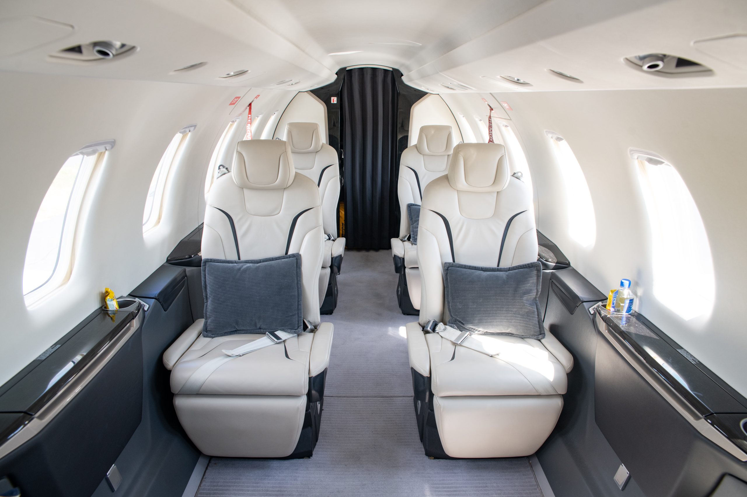 | This aircraft is completed with a Zermatt package six plus 2 passenger executive interior featuring forward lavatory, forward galley, removable aft storage and refreshment cabinets and 3 distinct and elegant cabin zones. The galley is equipped with a sink and 115 VAC outlet. The left side auxiliary galley provides additional storage The forward cabin is configured with four (4) place club seating pull out executive tables. The mid cabin features 2 forward facing executive chairs. The aft cabin can be configured with 2 forward facing commuter chairs or with a storage and refreshment cabinet All seating is in Bolero Classic light gray leather complimented by coordinating Manchester medium gray accents and lower sidewalls. All cabinetry is finished in high gloss Zebrano wood and chrome Pearlite plating. Entertainment features include XM Satellite radio. Inflight connectivity is through an Go-Go Biz ATG 2000 air-ground phone with 2 handsets, | |